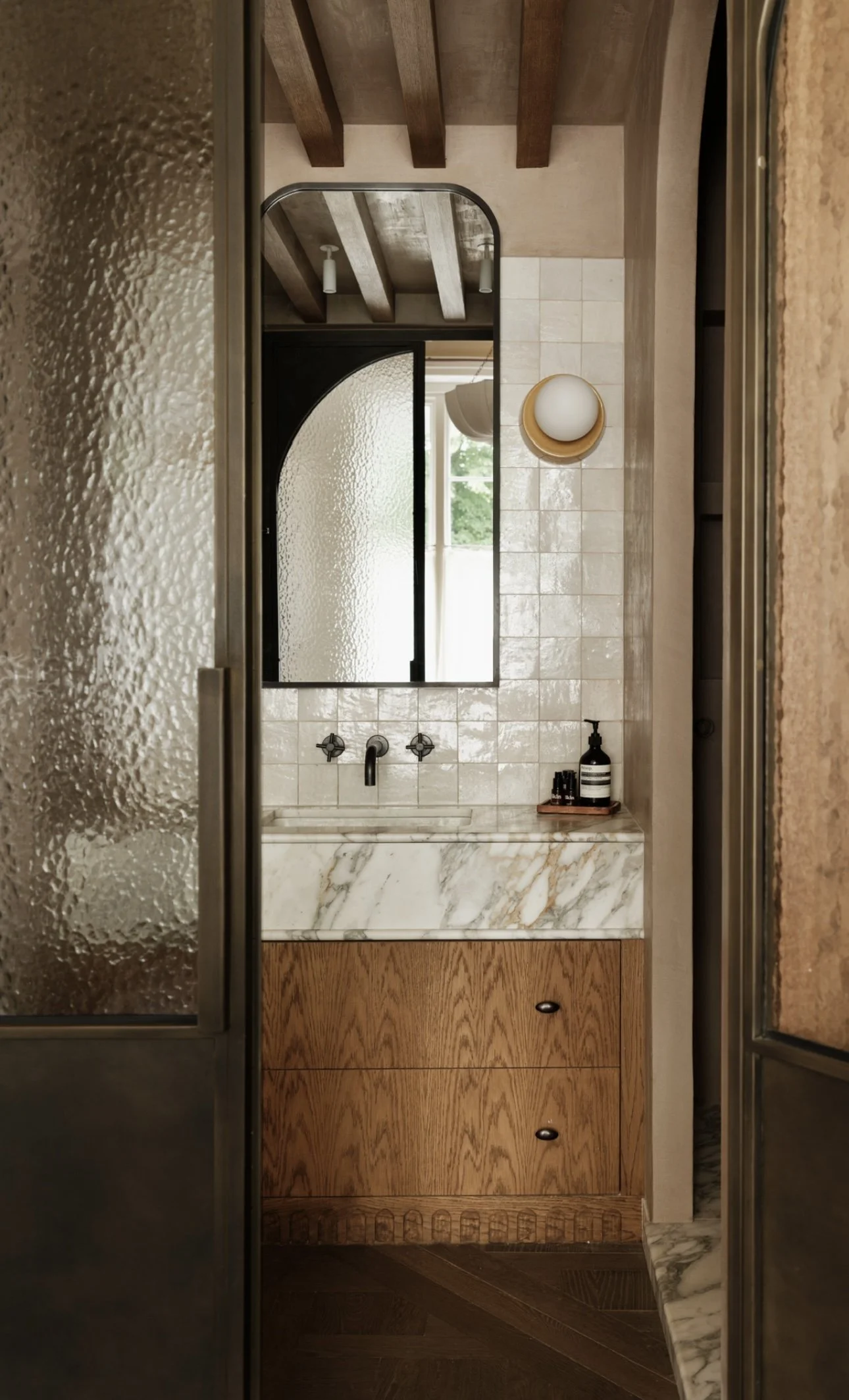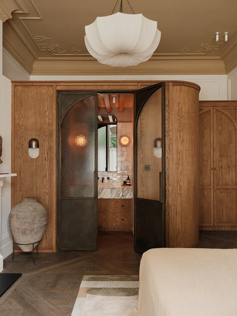 A wide entrance hall, lined with handmade walnut doors, sets the tone on arrival, offering a generous prelude to the considered interiors beyond.