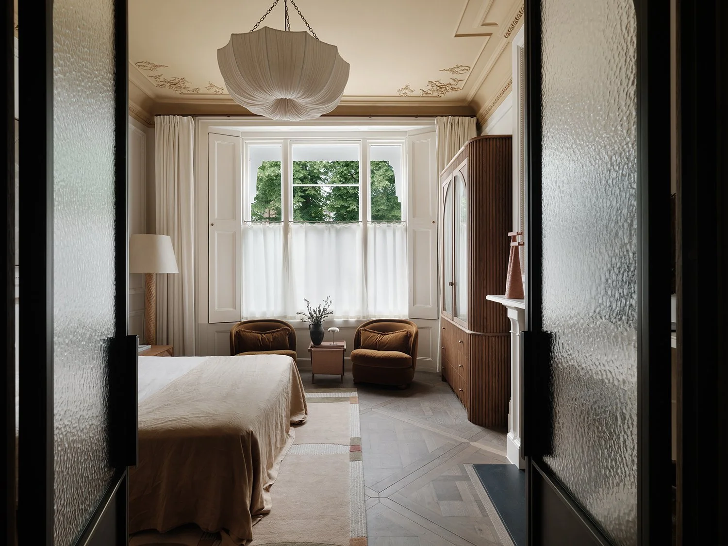 Original fireplaces anchor both the sitting room and principal bedroom, where heritage character is balanced with contemporary refinement.